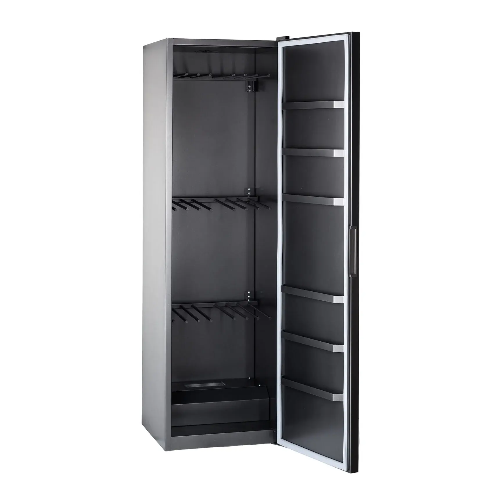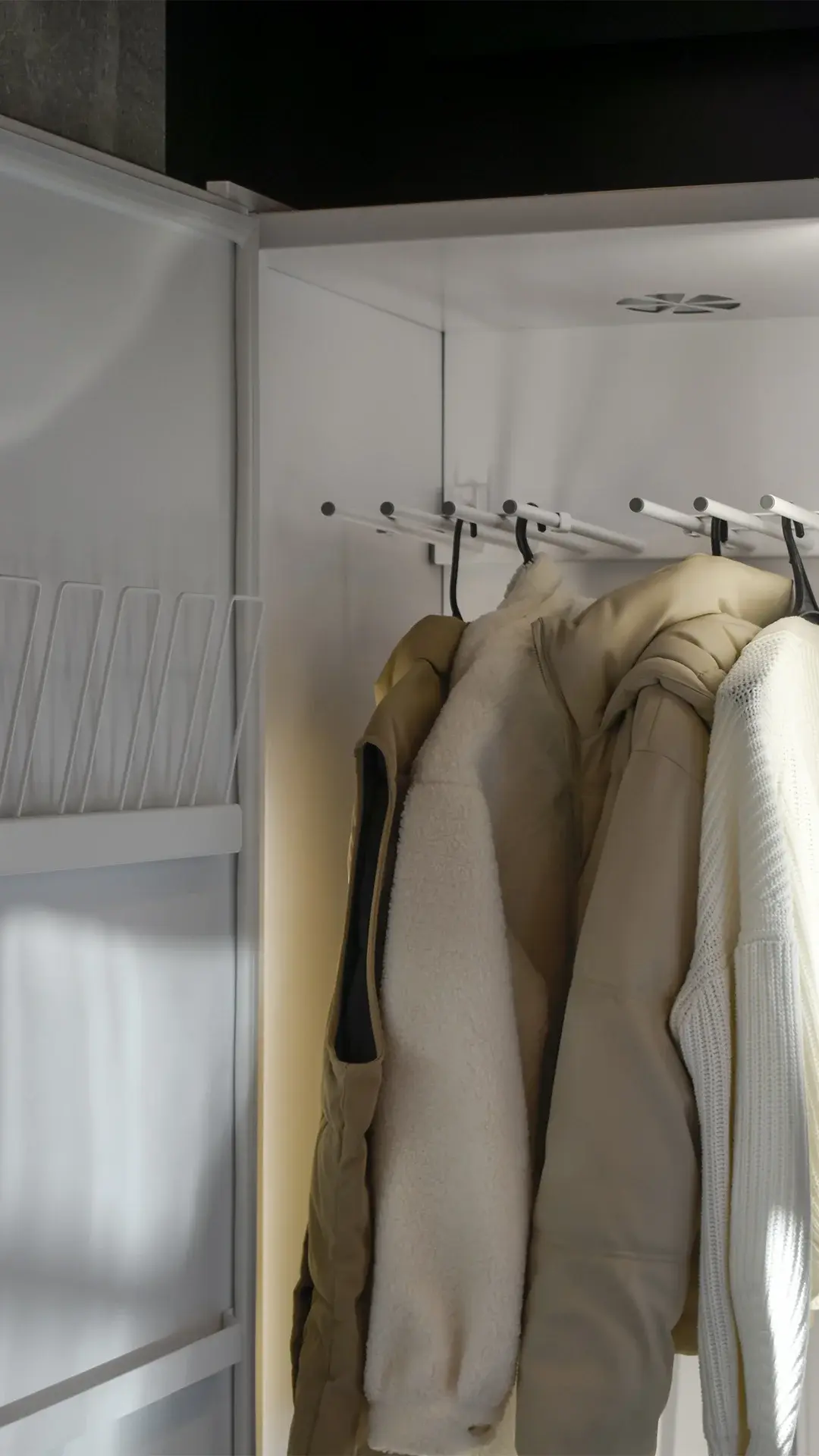 Этот шкаф бережно сушит вещи, которые нельзя обрабатывать в традиционной сушильной машине: вечерние платья, кашемир, кожаную обувь, спортивную экипировку и даже аксессуары — от шлемов до сумок. Вертикальное размещение одежды предотвращает деформацию и заломы, а съёмная перфорированная полка легко освобождает пространство под длинные изделия.